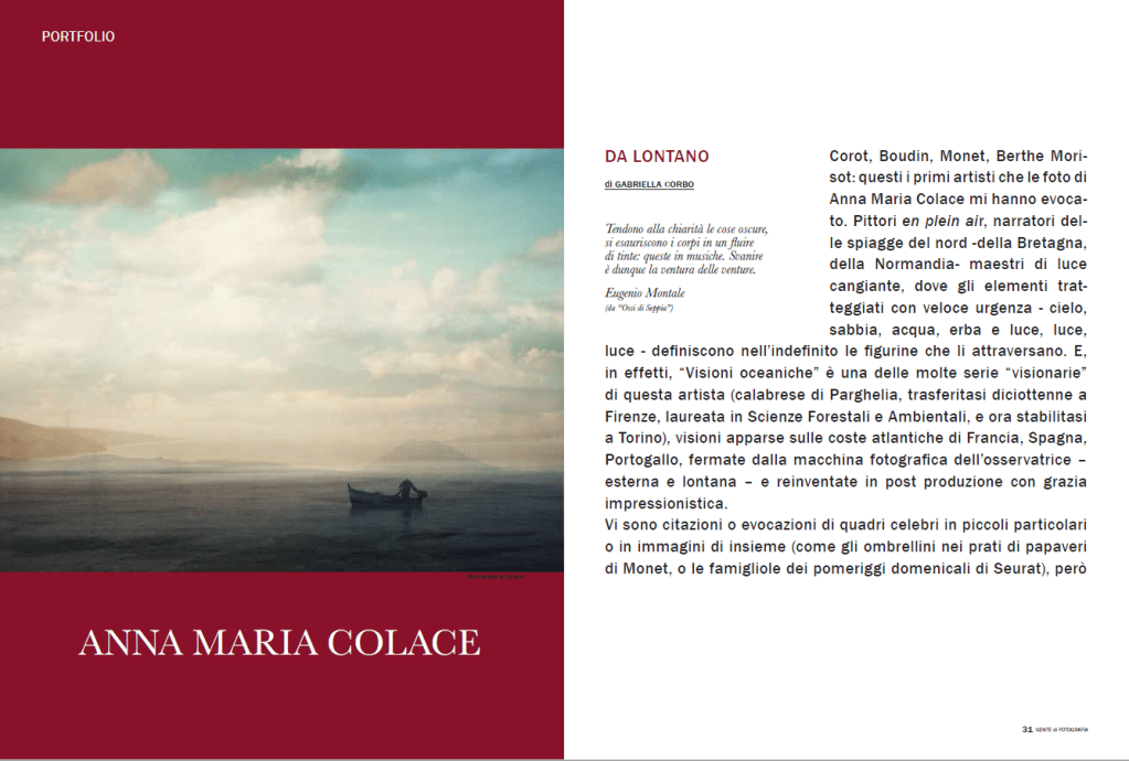 La mia collaborazione con la rivista GENTE DI FOTOGRAFIA è iniziata col n°76, quando sono usciti due miei articoli, uno che presentava il FESTIVAL DI FOTOGRAFIA EUROPEA 2021 - Sulla Luna e sulla Terra / fate largo ai sognatori! (Reggio Emilia, 21 maggio – 4 luglio 2021), e uno che recensiva la bellissima serie Visioni oceaniche di Anna Maria Colace. Condivido qui il testo di quest'ultimo articolo. Buona lettura.