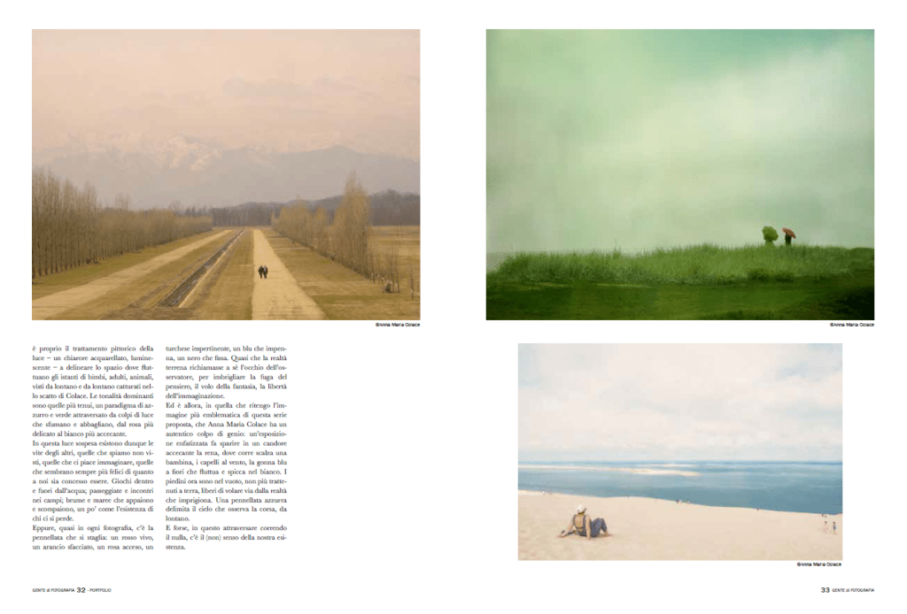 Vi sono citazioni o evocazioni di quadri celebri in piccoli particolari o in immagini di insieme (come gli ombrellini nei prati di papaveri di Monet, o le famigliole dei pomeriggi domenicali di Seurat), però è proprio il trattamento pittorico della luce – un chiarore acquarellato, luminescente – a delineare lo spazio dove fluttuano gli istanti di bimbi, adulti, animali, visti da lontano e da lontano catturati nello scatto di Colace. Le tonalità dominanti sono quelle più tenui, un paradigma di azzurro e verde attraversato da colpi di luce che sfumano e abbagliano, dal rosa più delicato al bianco più accecante.