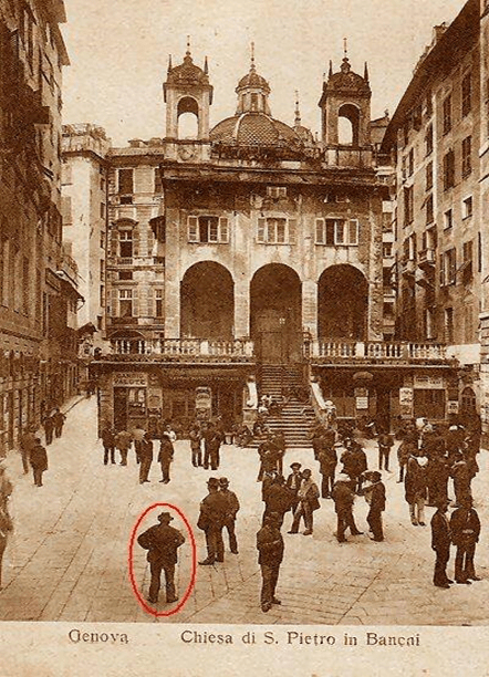 Quando, qualche tempo dopo, non avendo più avuto sue notizie al lavoro, lo vennero a cercare in casa, trovarono l’uscio ancora spalancato e l’appartamento deserto, come abbandonato in fretta e furia. La zia Pinin, che aveva accompagnato i carabinieri alla casa del nipote, raccolse il dagherrotipo ancora sul pavimento, tra i vetri infranti. “Di cosa si tratta, signora?” la interrogò il maresciallo con garbo inquisitorio. “Ninte, ninte, – rispose la vecchia asciugandosi, col dorso della mano increspata di anni, gli occhi nebbiosi di lacrime e ricordi – o l’ëa o presente ch’aveivo faeto a mae nevo pe’ Dënâ. A l’è unna vegia fotografia da ciassa Banchi, donde seu baccan gh’aveiva o scagno” (13). “Sciâ mïae – continuò – o poae o l’è sto chi: mae nevo o l’ëa paegio!” E indicò l’ultima figura apparsa sul dagherrotipo: un uomo ripreso di spalle, a gambe leggermente divaricate, le braccia appoggiate sui fianchi, come a scrutare la piazza davanti a lui.