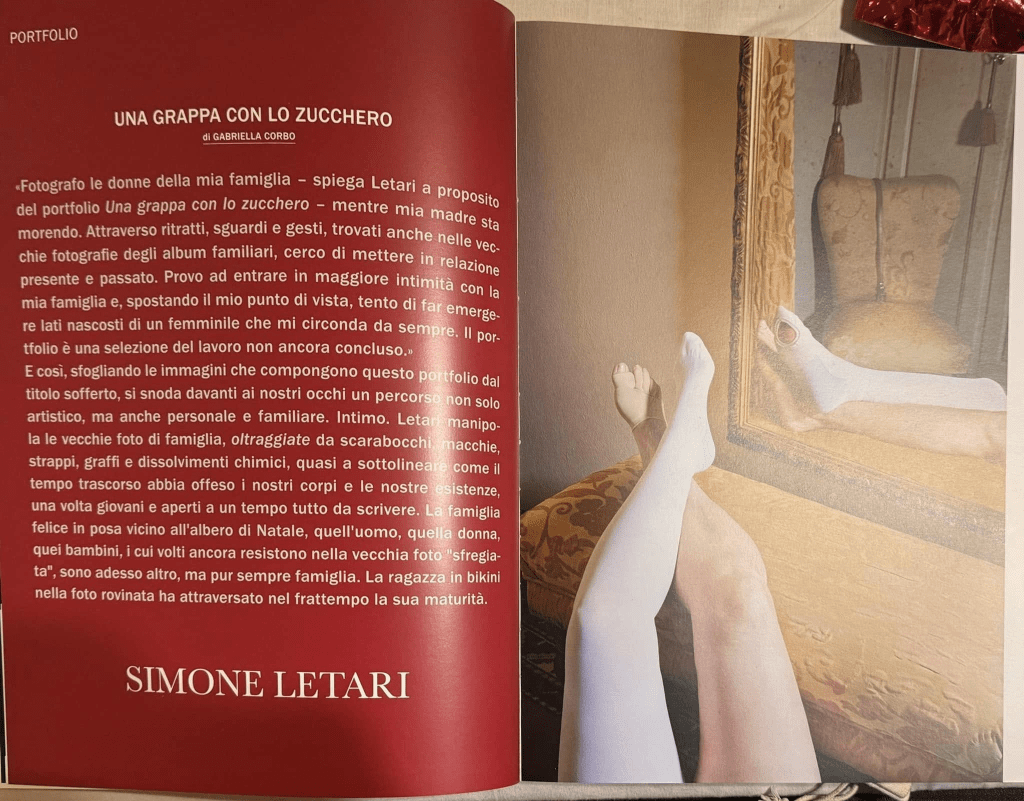 «Fotografo le donne della mia famiglia – spiega Letari a proposito del portfolio Una grappa con lo zucchero – mentre mia madre sta morendo. Attraverso ritratti, sguardi e gesti, trovati anche nelle vecchie fotografie degli album familiari, cerco di mettere in relazione presente e passato. Provo ad entrare in maggiore intimità con la mia famiglia e, spostando il mio punto di vista, tento di far emergere lati nascosti di un femminile che mi circonda da sempre. Il portfolio è una selezione del lavoro non ancora concluso.».